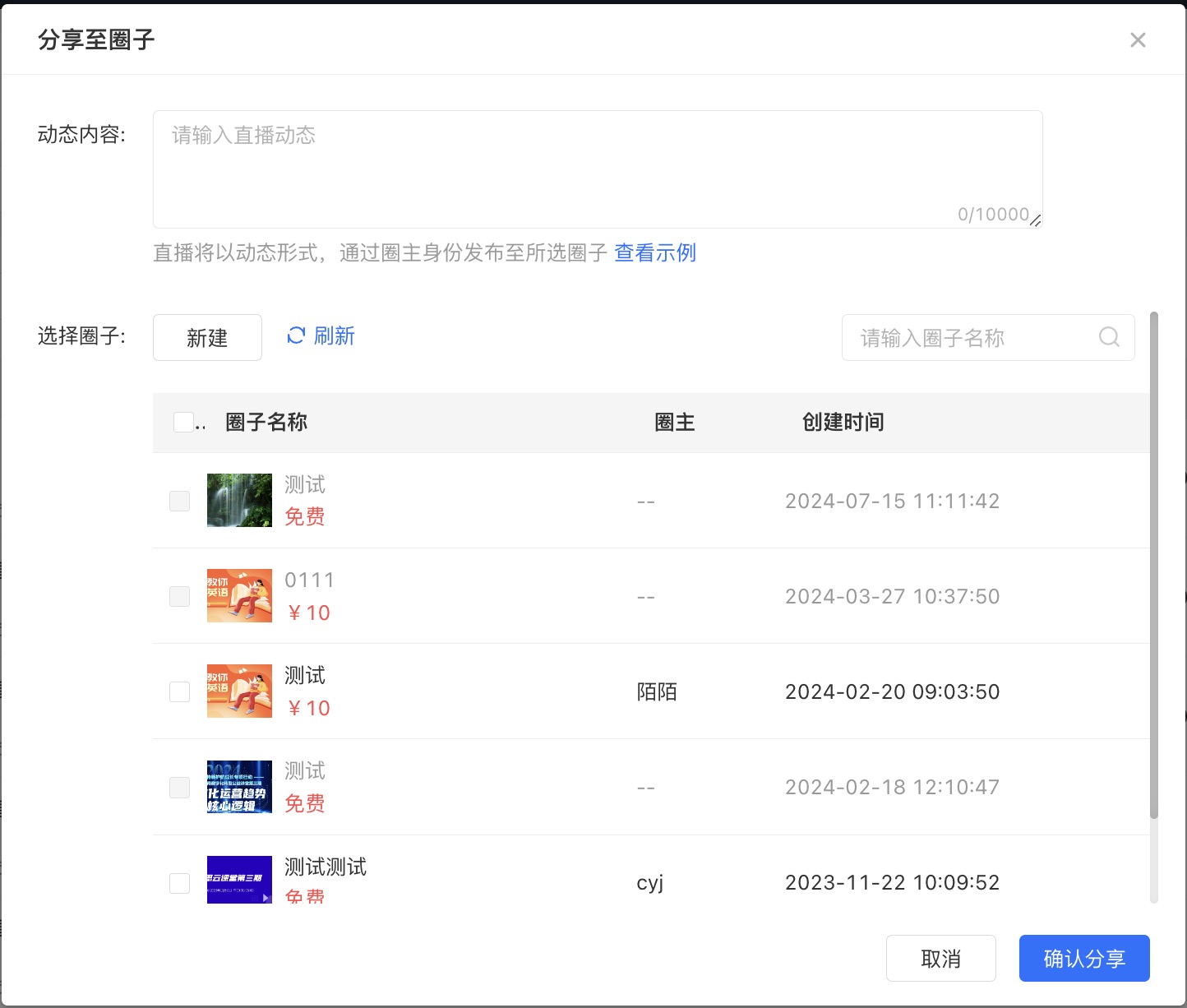 直播间创建后,可将直播以动态形式分享至多个圈子。