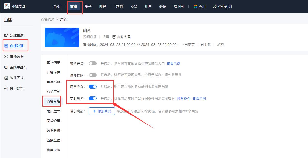 小鹅通商家用户在自己的小鹅通店铺管理后台找到“直播”——“直播管理”里面找到要开播的直播间,点击直播间后面的“管理”按钮,进入直播间详情,点击“直播间带货”,开启“显示库存”和“实时热卖”按钮就可以了。
